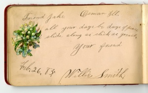 This is National Autograph Collecting Week, and as we know the hunting of celebrity autographs–on every conceivable surface from baseballs to the backs of hands has never been more frenzied. Back in the late 1800s, one of the fads among young people was the autograph book, and with it came the art of writing tokens of affection for one’s friends in these small, cherished volumes that have all but disappeared unless one has fortunately survived in your family.